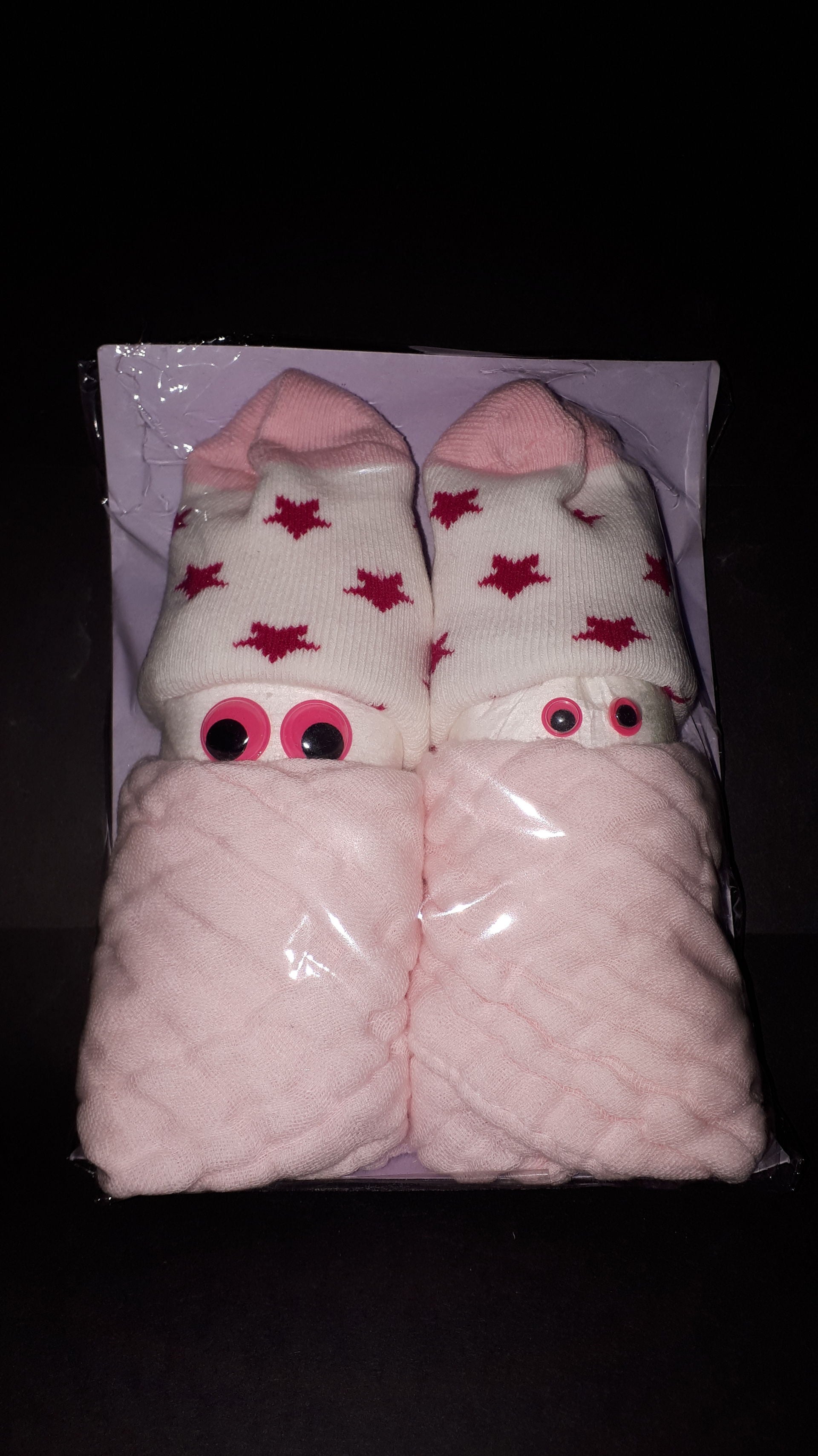De mini-luier baby bestaat uit 2 luiers, 2 spuugdoekjes en één paar sokjes leuk verpakt.