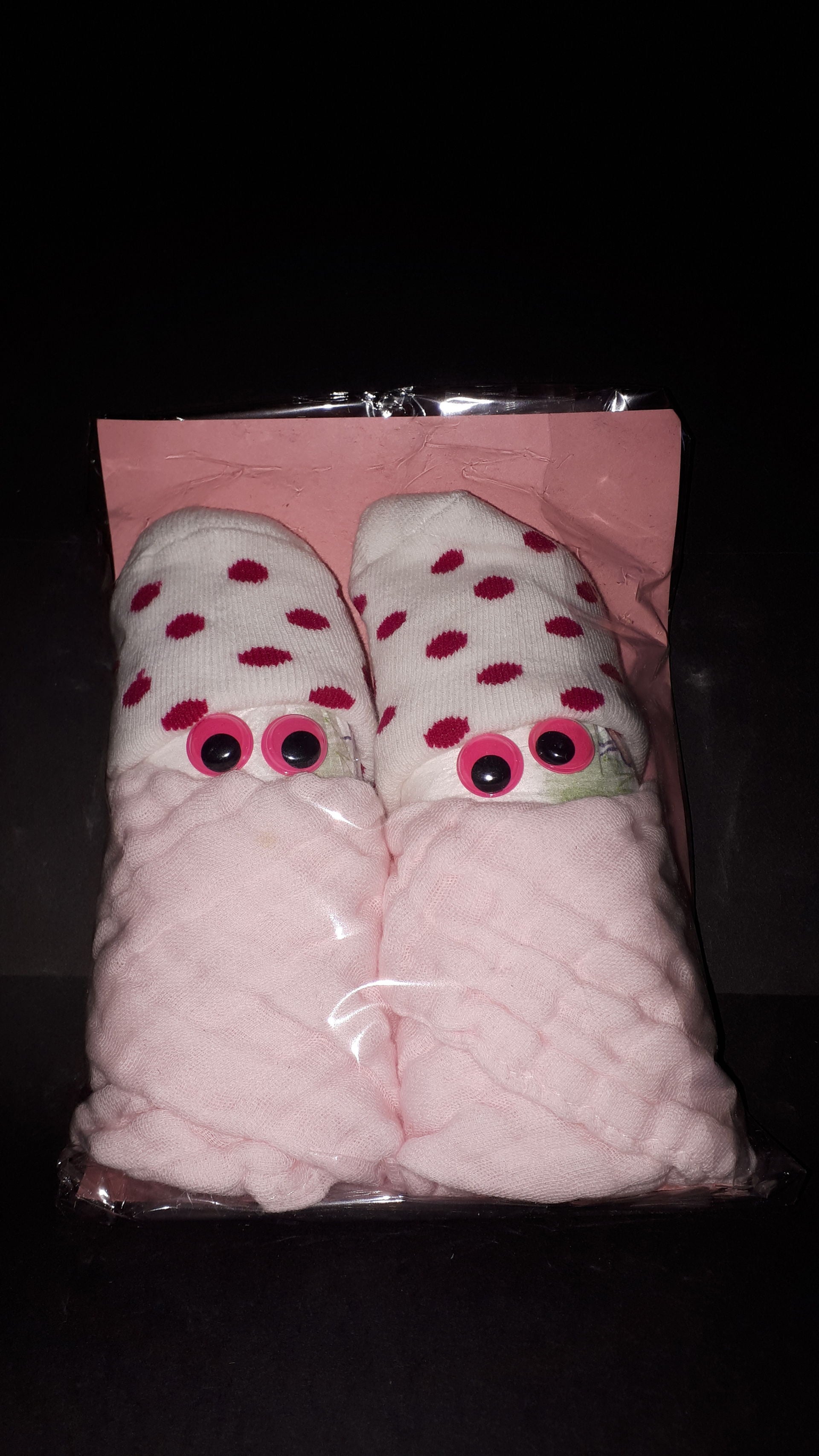 De mini-luier baby bestaat uit 2 luiers, 2 spuugdoekjes en één paar sokjes leuk verpakt.