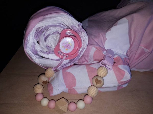 Een box pakje gevuld met 21 luiers. Incl speen en speenkoord.