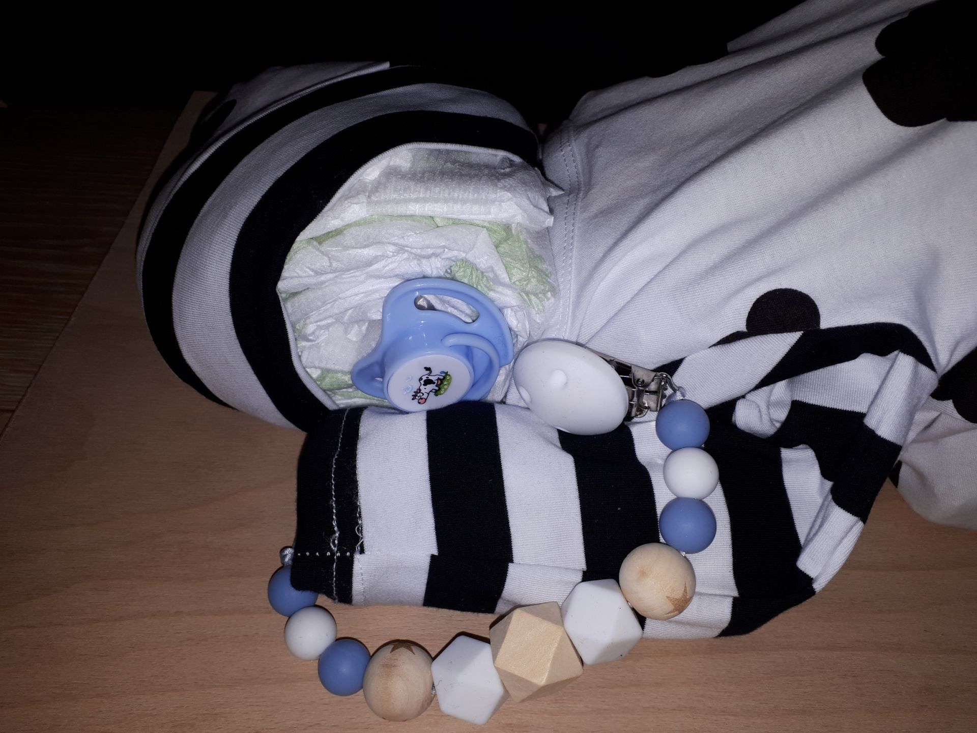 Box pakje met mutsje, 21 luiers en speen met speenkoord